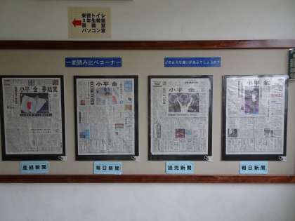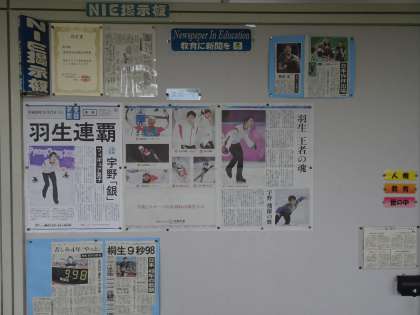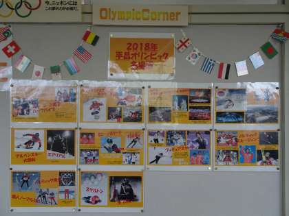 オリンピックコーナーには、平昌オリンピックの名場面が掲示されています。また、NIE掲示板には、オリンピックに関する新聞記事が掲示されています。4紙の記事を読み比べてみましょう。(遠藤)
