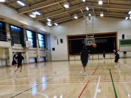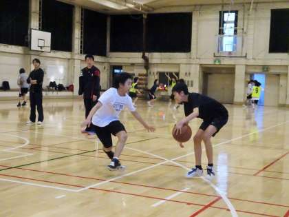 男子の1対1では、オフェンスもディフェンスも互いに全力でやり合い、いい雰囲気で練習していました。女子は4対2の速攻の練習です。アウトナンバーでのオフェンスは必ずフリーの選手がいるので、最小限のパスでシュートにいきましょう。(遠藤)
