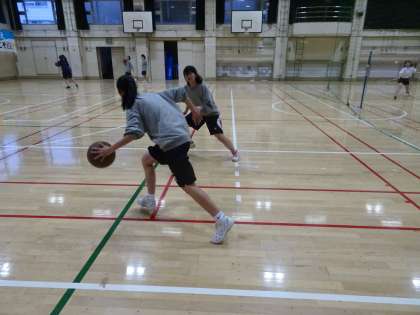女子バスケットボール部が体育館で活動しています。1対1をやっています。ドリブル練習でやっているバックチェンジやロールを使ってディフェンスをかわしましょう(遠藤)