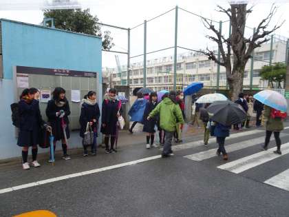 あいさつ運動3日目です。今日は弦巻小学校にあいさつ運動に来ています。雨雲を吹き飛ばすような元気なあいさつが聞こえてきます。(遠藤)