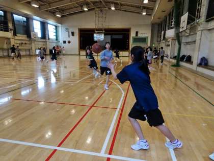 体育館ではバスケットボール部が活動中です。男子はリバウンドからのゴール下シュート、女子はスクエアパスをやっていました。(遠藤)