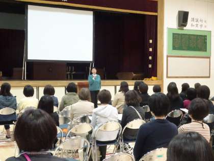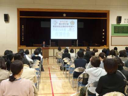 本日、保護者会を行いました。体育館の全体会では校長先生や各分掌主任の先生から学校評価や春休みの過ごし方について話がありました。