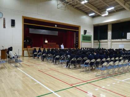 3年生が体育館で最後の卒業式練習を行っています。明日に向けて、最後の確認をしています。(遠藤)