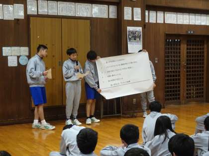 今年度最後の学年集会を行いました。学級委員からは「よい学年とは」のアンケートの集計結果について話がありました。また、先生から学習面と生活面について話しがありました。3年生では、自分たちが考えるよい学年を目指してがんばっていきましょう。(遠藤)