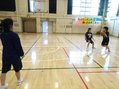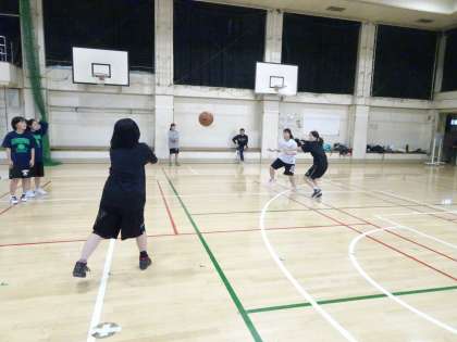 15時から体育館では女子バスケットボール部が活動しています。45度からの1対1をやっています。ディナイで着くときはマークマンとボールマンの両方を視野に入れておきましょう。(遠藤)