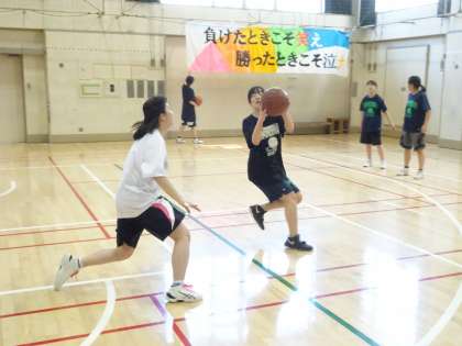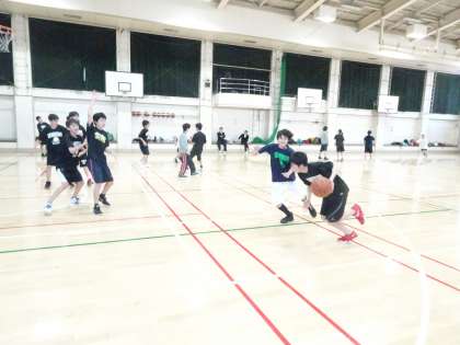 男子はハーフコートで5対5をやっています。女子は45度からの1対1をやっていました。(遠藤)