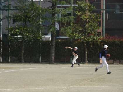 校庭では野球部が活動しています。外野手がランナーになり内野の守備練習をしていました。(遠藤)