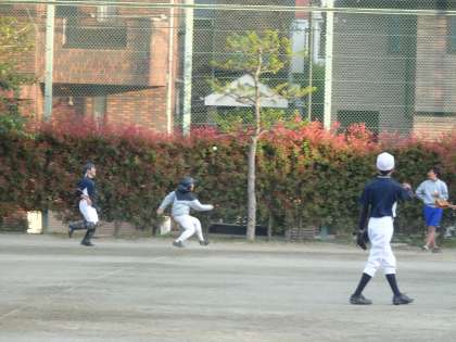 校庭では野球部が活動しています。ランナーをつけて内野の守備練習です。ランダウンプレーは若い塁の方へランナーを追っていきましょう。(遠藤)