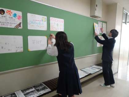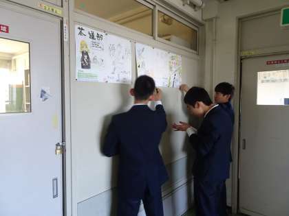 朝から部長たちが部活動の勧誘ポスターを1年生のフロアーと多目的室前の掲示板に掲示しています。(遠藤)