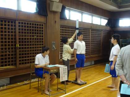 3年生が身体計測を行っています。1年間で何cm伸びたでしょうか?視力は下がっていないでしょうか?(遠藤)