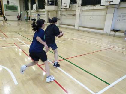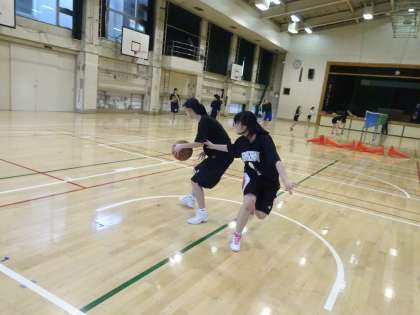 女子バスケットボール部が体育館で活動中です。1対1をやっていました。ディフェンスとボールの間に自分の体を入れてボールを奪われないようにしましょう。(遠藤)