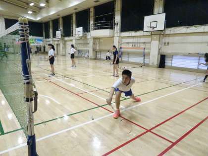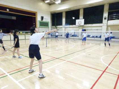 バドミントン部が体育館で活動しています。基礎打ちの練習です。ギリギリまで手を伸ばしてシャトルを落とさないようにがんばりましょう。(遠藤)