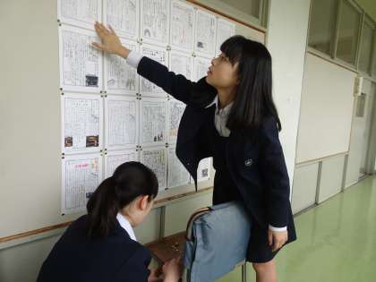 春休みの宿題になっていた修学旅行の事前学習を廊下に掲示しました。自分たちのコースを決めるときの参考にしましょう。(遠藤)