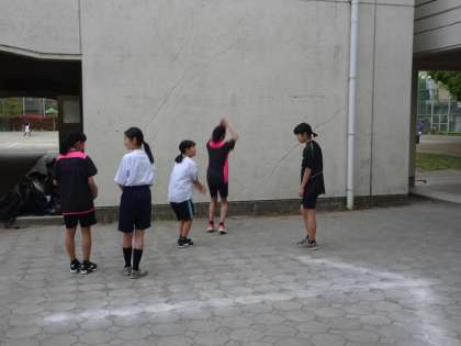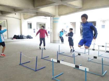 プール下では陸上競技部と女子バレーボール部が活動しています。陸上競技部はハードルを使って下半身のトレーニングです。女子バレーボール部は2年生が1年生にスパイクの入り方を教えていました。(遠藤)