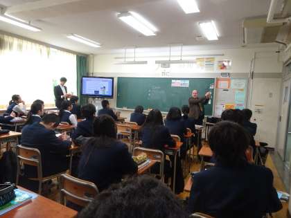 2年生の英語の授業の様子です。ALTのクリス先生が自己紹介をしているところでした。(遠藤)
