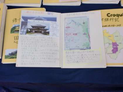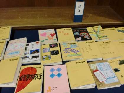 現在開催中の校内作品展は、後2日となりました。力作や創意が凝らされた作品がたくさんあります。その中で、特に注目していただきたいのが、三年生の修学旅行をまとめた「クロッキー帳」です。一人一人が一冊90ページの長編に挑みました。それぞれが表紙をデザインし、目次からはじまり、事前調べの記録、現地のレポートと感想、記念の資料、写真などを工夫して丁寧に書いてまとめてあります。特に、一番最後の2ページには、総合的な感想とクロッキー帳作成の感想があり必見だと思います。修学旅行を実施することの価値や本校生徒の感受性や豊かな心の成長の一端を見ていただけるのではないかと思います。困ることは、長編なので何冊か丁寧に読んでいくと、かなり時間と体力が必要なことです。