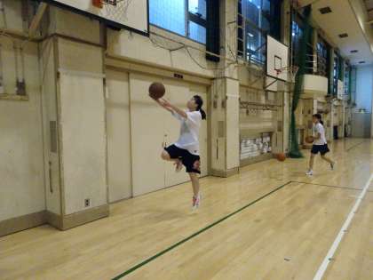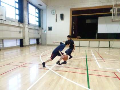 体育館ではバスケットボール部が活動しています。男子は45度からの1対1、女子はシュート練習をしていました。(遠藤)