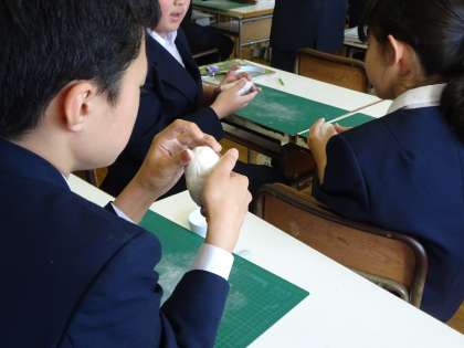 2年生の美術の授業です。石塑粘土を使って不思議な玉子を作っていました。(遠藤)