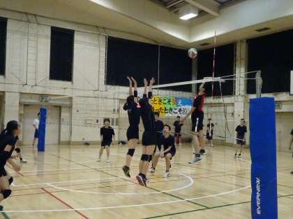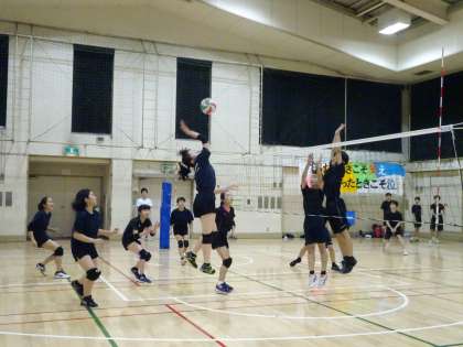 体育館ではバレーボール部が活動しています。男子VS女子で試合形式の練習をしていまいた。(遠藤)