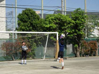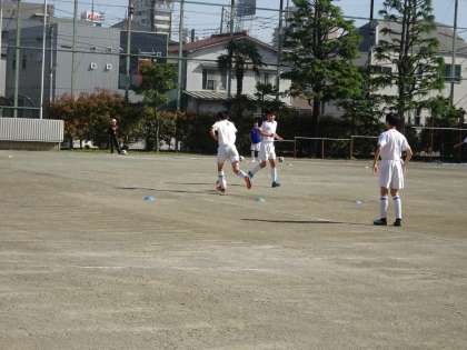 校庭ではサッカー部が活動しています。ボールをきちんとトラップして次のプレーに移りやすい位置に置けるようにしましょう。キーパーはキャッチングの練習です。(遠藤)