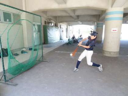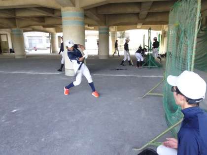 野球部がプール下でトスバッティングをしています。フルスイングをしてもボールを芯でとらえられるようにボールを最後まで見てスイングをしましょう。(遠藤)