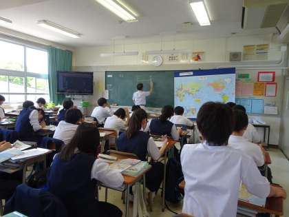 1年生の社会の授業の様子です。地図を見ながら時差の求め方を学習していました。(遠藤)