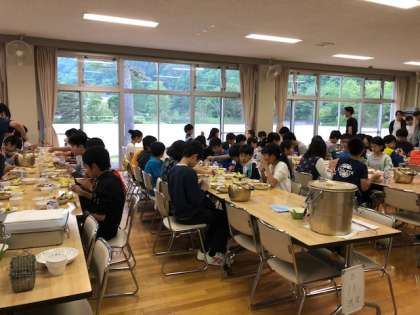 1日目の夕食はカレーライスです。しっかり食べて明日のオリエンテーリングに備えましょう!(多久)