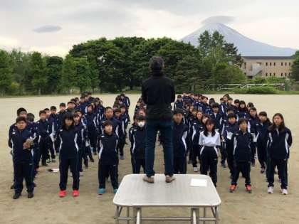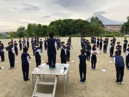 2日目、少し曇り空ですが校庭で朝礼です。元気にラジオ体操をしました。(多久)