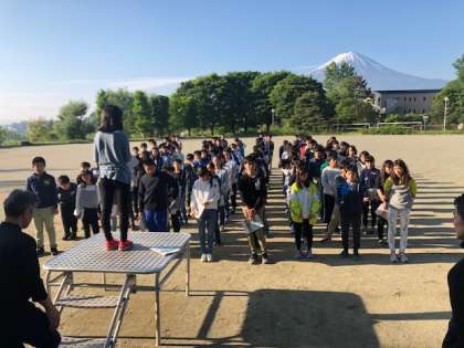 3日目の朝礼です。昨日よりも富士山がくっきりとそびえ立って見えます。(多久)