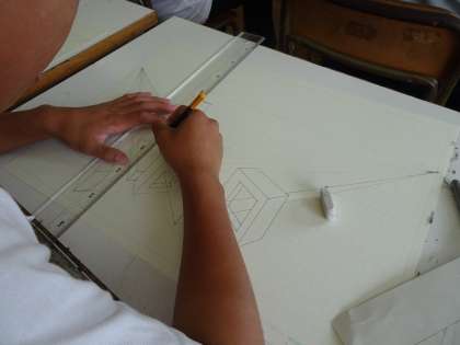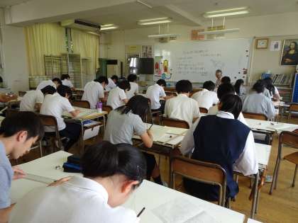 3年生の美術の授業です。平面構成をしています。広がりや奥ゆきを使って立体感を出しましょう。(遠藤)