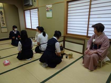 茶道部が若竹庵で活動しています。お手前の稽古をしていました。(遠藤)