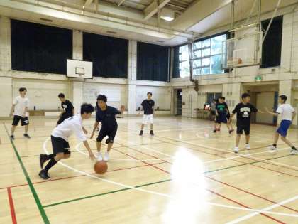 体育館では男子バスケットボール部が活動しています。ハーフコートで5対5をやっています。常に試合を意識したプレーをしましょう。(遠藤)