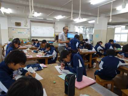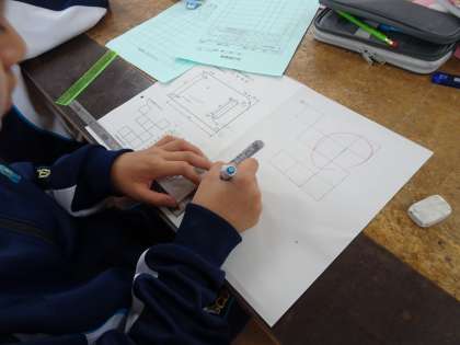 1年生の技術の授業です。製図の読み方を学習し、さしがねを使って実際に図を描いていました。(遠藤)