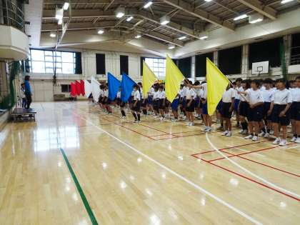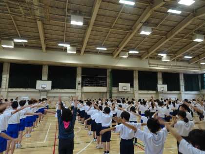 5時間目は運動会の全校練習です。雨が降っているので体育館で行っています。入退場やラジオ体操の練習をしています。(遠藤)