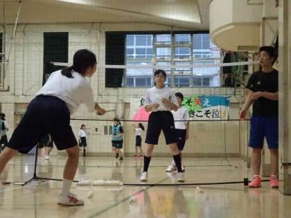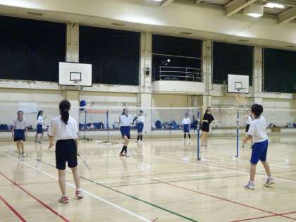 バドミントン部が体育館で活動しています。2,3年生は試合形式の練習をしています。1年生はサイドで基礎練習をしていました。(遠藤)
