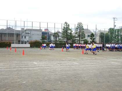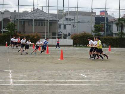 1,2時間目、2年生が運動会の学年練習を行っています。学年種目のハリケーンの練習をしていました。手を離さず、コーンをきちんと回ってきましょう。(遠藤)