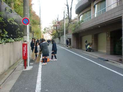 一昨日の木枯らしで、色づき始めていた木の葉が舞い散り、学校の周りの道路にもたくさん落ちてしまいました。毎年恒例の「落ち葉掃き」を急遽、今日から始めました。今日は一年生が当番でした。タンチ山や街路樹から落ちた落ち葉を初めて掃きました。