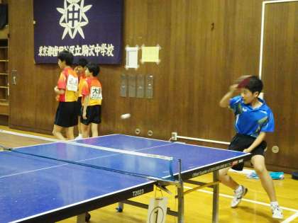 格技室では卓球部が練習試合を行っています。相手は千歳中です。全勝めざしてがんばりましょう。(遠藤)