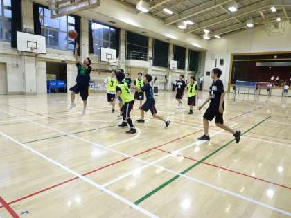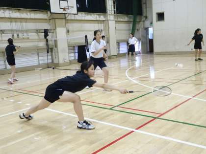 体育館ではバドミントン部と男子バスケットボール部が活動しています。夏季大会も近くなり集中して練習しています。(遠藤)