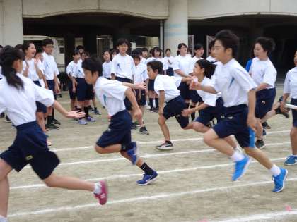 運動会の朝練が行われています。今日は1年生がトラック、3年生がフィールドでの練習です。1年生は全員リレー、3年生はむかで競争の練習をしています。(遠藤)