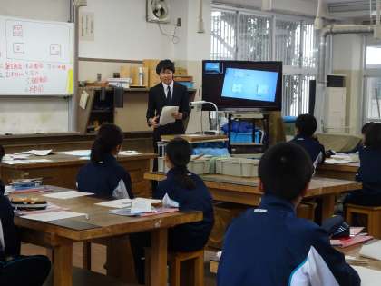 技術科の教育実習生が研究授業を行いました。「第三角法による正投影図が描ける」というめあてを達成するために、ICTを用いて投影図の描き方の説明をしていました。(遠藤)