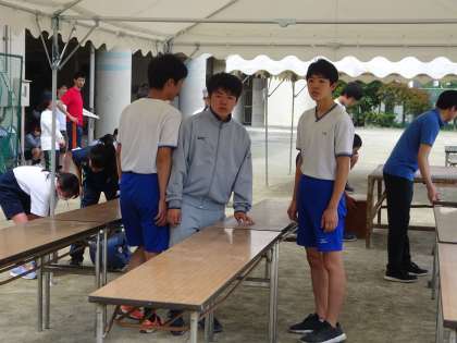 運動会の準備が行われています。サッカーゴールを移動させたり、テントを張ったりしています。明日にむけてきちんと準備しましょう。(遠藤)