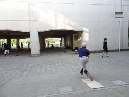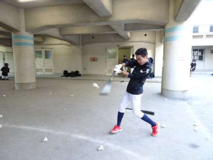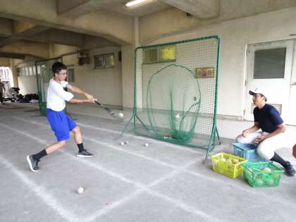 野球部がプール下で活動しています。トスバッティングや羽打ち、ピッチング練習をしています。(遠藤)