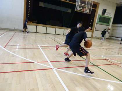 体育館ではバスケットボール部が活動中です。男子は1対1、女子はレイアップシュートの練習をしています。(遠藤)