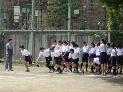 1年生の体育の授業の様子です。男子は格技室で長座体前屈を測定しています。女子は校庭でクラウチングスタートの練習をしていました。(遠藤)