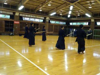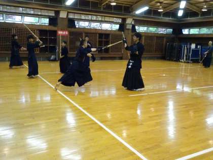 格技室では剣道部が活動しています。足さばきの練習や上段からの面打ちの練習をしていました。(遠藤)