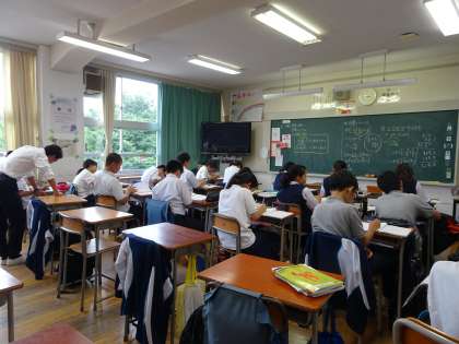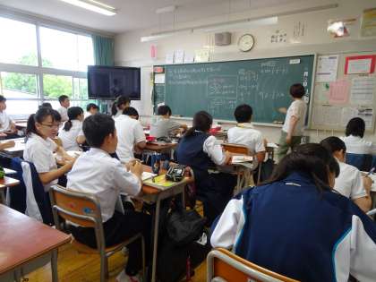 1年生の数学の授業です。正負の数の分配法則について学習していました。分配法則を利用して複雑な計算をかんたんに計算できるようにしましょう。(遠藤)