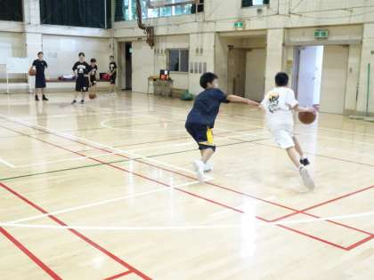 男子バスケットボール部が体育館で活動しています。45度や0度からの1対1をやっています。明日は夏季大会の3回戦です。けがをしないように集中して練習しましょう。(遠藤)