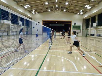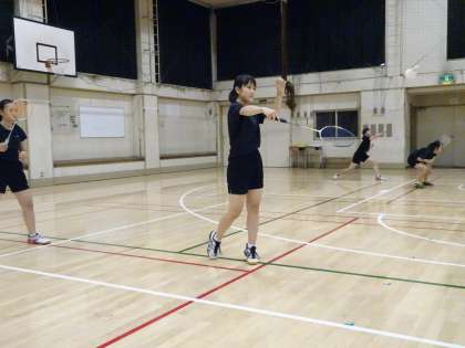 バドミントン部が体育館で活動しています。基礎打ちの後、今週末の夏季大会に向けて実戦練習をしていました。(遠藤)