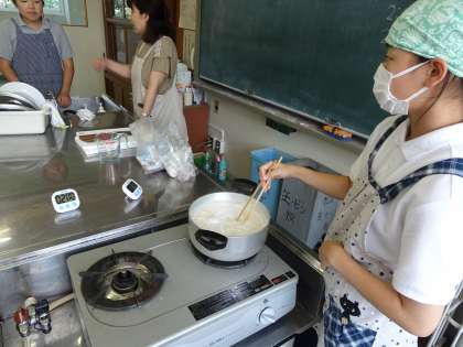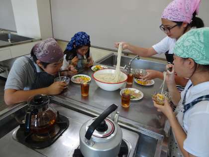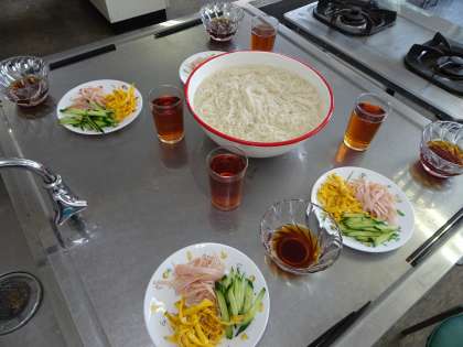 期末考査が終了し、家庭科部が恒例の定期考査最終日の昼食を作っています。メニューはそうめんです。今日のような暑い日にはぴったりですね。(遠藤)